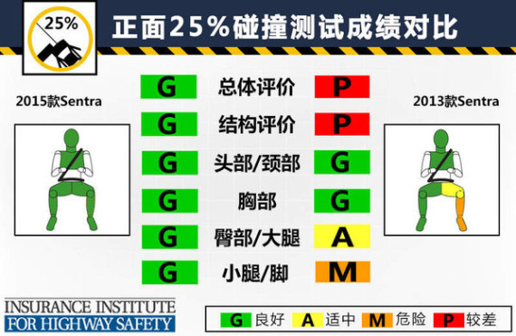 这次参加碰撞测试是2015款Sentra,我们选择2013款Sentra作为对比车型。IIHS碰撞测试共分为正面25%碰撞、正面40%碰撞、侧面碰撞、车顶及颈部保护5大项。在相对温和的后4项测试中,两车均取得“G”(良好)评价,而在最为严苛的正面25%碰撞测试中,由于2013款Sentra在臀部/大腿项得到“A”(适中),以及小腿/脚项得到“M”(危险),且车身结构成绩为“P”(较差),因此该项总评成绩较差,而2015款Sentra各小项均获得最高评价,与2013款车型相比,新款车型在小面积碰撞测试中提升显著。