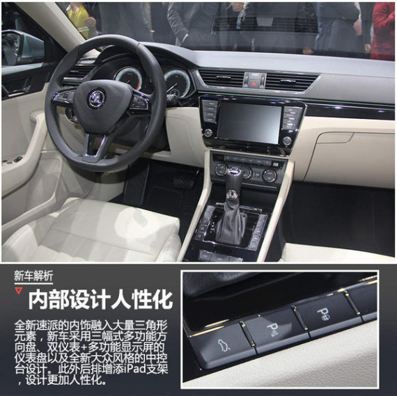 内饰方面,全新斯柯达速派融入了大量三角形及锐角元素,配色方面新车采用黑色+巧克力棕相搭配,做工用料方面相比现款有所提升。新车方向盘采用三幅式多功能方向盘,仪表盘采用双仪表+多功能显示屏的设计。中控台控制区域划分以及按键区上做了优化,操作更简洁。新车轴距上的加长使得后排空间更宽裕并配备后排空调,值得一提的是,新车在前排头枕后面与后排中央扶手内设置了iPad支架,十分人性化。