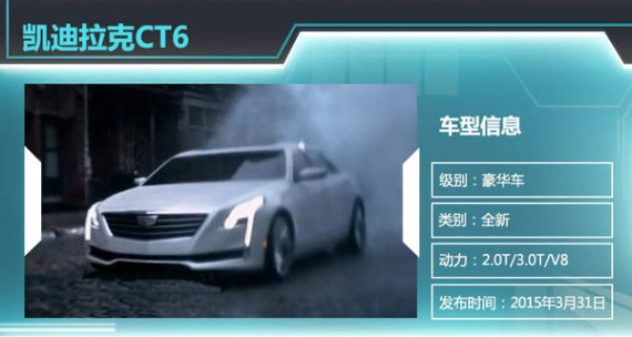 凯迪拉克CT6此前在奥斯卡颁奖礼电视宣传片中首度曝光,除3.0T引擎外还将搭载2.0T和一款V8引擎,将在通用位于底特律的汉姆川克(Hamtramck)工厂制造,预计会在2015年年底前投产。此外,鉴于中国市场在凯迪拉克的全球战略中占有越来越重要的地位,CT6未来将实现国产销售,进一步提升凯迪拉克在中国豪华车市场的竞争力。