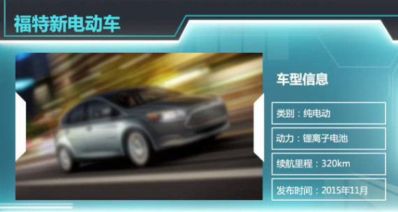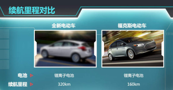 福特方面此前表示,在制造新能源车时将尽可能应用现有技术平台,与此同时在某些环节也会帮助其供应商降低成本以达到整体降低价格的目的。现款福克斯电动车采用电机和高压锂离子电池组驱动,最高车速可达136公里/小时,续航里程达到160km,车辆采用的锂离子电池组由LG公司提供。福特即将推出的全新电动车也有望使用LG公司的锂离子电池,据悉,新车的续航里程将达到320公里。与之前的福克斯电动车相比,新车的续航里程将实现翻倍。