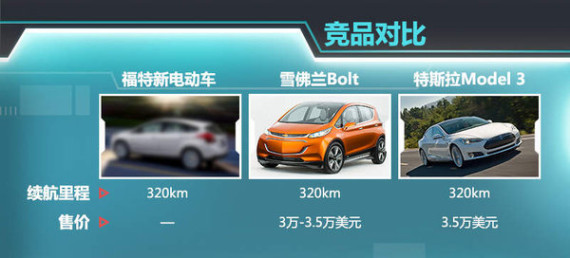 通用汽车此前推出的雪佛兰Bolt概念车续航里程达到320km,预计售价为3万-3.5万美元(约合人民币:18.7万-21.8万元),预计将于2017年正式投放市场。此外,特斯拉也将在2017年推出入门级电动车Model 3,新车续航里程同样将达到320km,售价在3.5万美元(约合人民币:21.8万元)。与这辆款车相比,福特全新电动车续航里程将与其处于同一级别。而据福特官方此前透露,福特制造新能源汽车的核心思路之一:制造让所有人都买得起的新能源汽车。要与Bolt和Model 3相竞争,全新电动车的售价也有望与之相匹配。