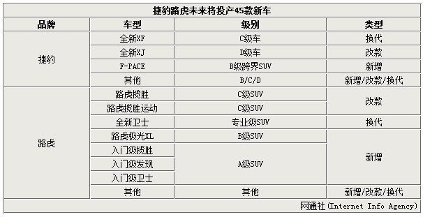 捷豹路虎曾计划到2020年将产量翻番达到60万台,占世界SUV市场的3%。不过,随着市场的不断变化,捷豹路虎也在加快自己发展的脚步,继续加大投入并开发更多产品。去年捷豹路虎中国执行副总裁王燕女士曾向网通社表示:捷豹路虎投资35亿英镑(约合350亿人民币),用于新产品的研发费用,而之后的几年也将保持这一水平。以发现神行为开端,捷豹路虎开启了5年推出50款新车的大幕,时至今年,捷豹路虎还将继续发布45款新车。