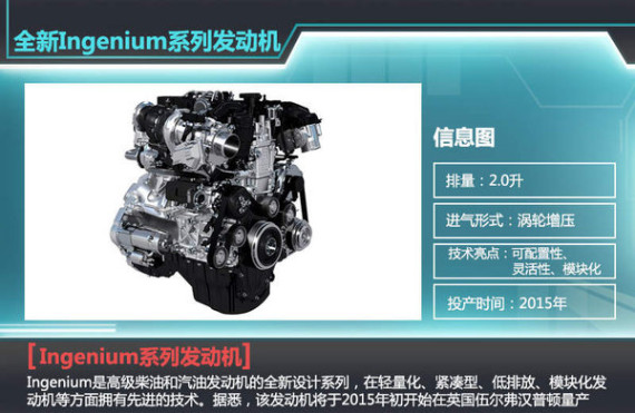 Ingenium系列发动机是捷豹路虎摆脱福特的控制之后自主研发的首款引擎,目前已经在英国Wolfgang Ziebart工厂投产。这款发动机采用电控油泵和水泵,滚针轴承凸轮轴和平衡轴,电控活塞冷却喷嘴等一些列先进技术,相比目前搭载的福特引擎更加先进。随着产量的提升未来捷豹路虎旗下车型将陆续搭载Ingenium系列发动机。捷豹路虎动力系统工程总监Ron Lee表示:“兼容性和灵活性是Ingenium发动机的两个核心特点,因为我们从一开始便在新发动机上采用了永不过时的技术。当燃油、涡轮增压、排放、性能和电气化方面的新技术可供使用时,Ingenium发动机可以将其纳入其中。”