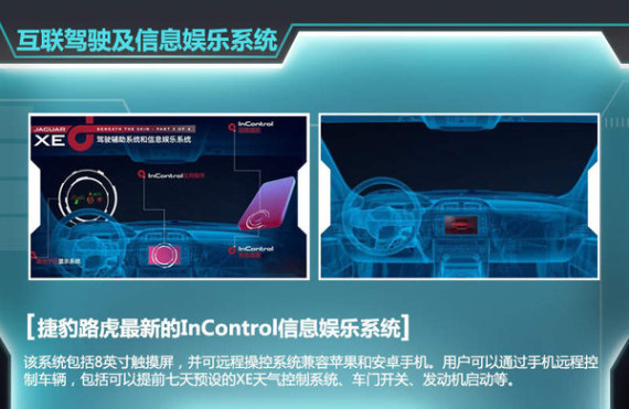 去年,全新的互联驾驶及信息娱乐系统InControl随捷豹XE一同亮相在巴黎车展上。这个智能人机交互系统包括一个8英寸的触摸显示界面,能偶融合iOS与安卓系统的应用软件,并且还能够充当移动设备的WiFi热点。另外一个新装备是InControl Remote系统,该系统允许用户与车子远程连接,而预先设定加热/冷却系统,确定车子在停车场内的位置,解锁汽车,甚至是起动发动机。该InControl系统还能够充当追踪设备,从而显示车辆被盗后的位置所在。该系统所拥有的语音系统,可以在使驾驶者在驾车过程中用语音命令操作设备而无需点选任何菜单,辅以激光HUD(抬头显示)的加入,极大的减少了因视线偏离路面而造成事故的可能性。