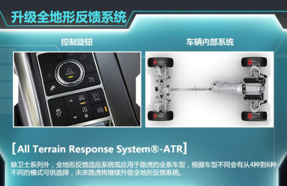 全地形反馈适应系统(TerrainResponse)是路虎获得发明专利的一项创新技术,该系统可使驾驶者轻松行走在各种非铺装路面上。这一整套系统包括变速器控制、ABS System Control(ABS系统控制系统)、Traction Control(牵引控制系统)、动态稳定控制系统、自适应动态控制系统、动力转向系统控制等各种子系统,但是驾驶者只需轻轻拨动控制旋钮就可获得适合所遇地形的最佳牵引性能、稳定性以及操控舒适性。未来,路虎还将在这套系统之上继续推出更加的智能、全面的改进型系统。