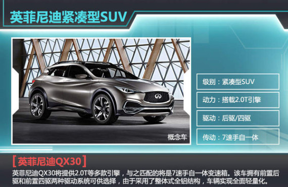 英菲尼迪旗下定位于紧凑型SUV的全新产品——QX30的概念车日前在日内瓦车展进行了首发亮相。新车的外观线条层次丰富,时尚而前卫的设计风格诠释了英菲尼迪品牌在设计领域的新突破。该车的长宽高分别为4430*1815*1520mm,离地间隙为192mm。在动力系统上,新车将会提供包括2.0T汽油发动机、柴油发动机在内的多种选择,与之匹配的将是7速手自一体变速箱。此外,英菲尼迪QX30拥有前置后驱和前置四驱两种驱动系统可供选择,由于采用了整体式全铝结构,车辆实现全面轻量化。英菲尼迪QX30的量产车型规划在2016年正式推向市场。