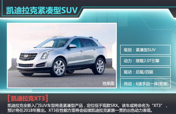 根据规划,未来凯迪拉克新车型将采用字母+数字的命名方式。所有SUV车型将采用“XT”作为开头,字母后的数字将反映车型相应的尺寸,以及在凯迪拉克产品阵营中的定位。凯迪拉克全新入门级SUV车型将是紧凑型产品,定位低于现款SRX。在新的命名体系下,该车或将采用“XT3”的名称,预计将在2018年推出。虽然是入门级SUV车型,XT3在性能方面同样会延续凯迪拉克家族一贯的出色动力表现。该车有望搭载2.0T四缸涡轮增压引擎,最大功率为164kW,最大扭矩达到339Nm。此外,XT3有望采用后驱设计进一步提升竞争优势,并将提供四驱版本。