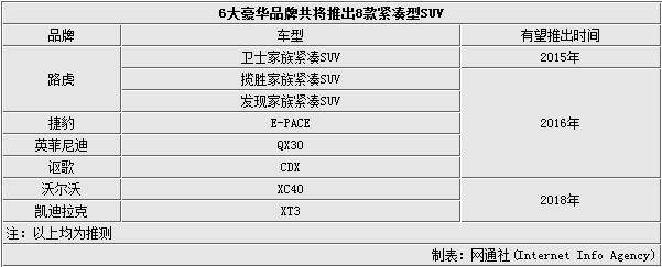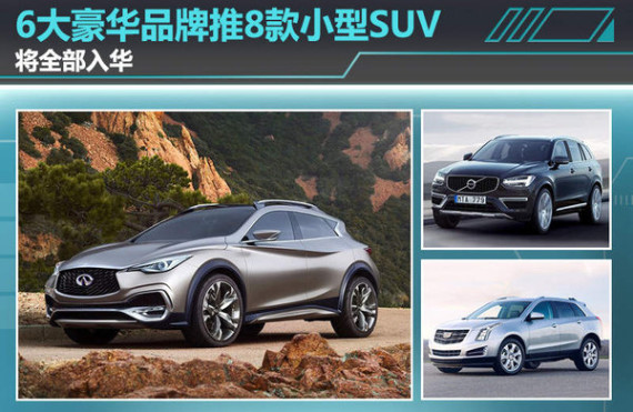 SUV车型在过去的2014年成为了国内汽车市场当中最畅销的车型产品,其中中小型级别的SUV产品无疑是发展潜力巨大的一类车型。目前奔驰、宝马、奥迪等豪华品牌均推出了诸如GLA、X1、Q3等紧凑型SUV,且不少产品都已进行过改款。在不久的将来会有更多的豪华品牌加入中小型SUV细分市场的竞争当中,推出紧凑型级别的全新车型。近日,媒体在对各大豪华品牌未来将推出的新产品进行汇总后发现,6家车企将涉足中小型SUV领域。据了解,共有8款全新紧凑型SUV产品将问世,一经推出将全部投放到国内市场当中。