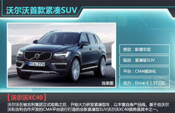 沃尔沃在被吉利集团正式收购之后,开始大力研发紧凑型车,以丰富自身产品线。沃尔沃全新“40”系列车型就将定位于紧凑型车市场,并基于由沃尔沃和吉利合作开发的CMA紧凑型模块化平台进行打造。沃尔沃XC40是其中之一,虽然该车将一些跨界的元素融入到设计当中,但作为纯粹的SUV车型,其与同品牌下偏向于旅行车的V40 Cross Country跨界车型形成了明显的市场差异。在动力方面,这款定位于紧凑型SUV的入门级车型有望搭载沃尔沃最新的Drive-E系列1.5T三缸引擎,并提供搭载同系列2.0T四缸引擎的版本。根据沃尔沃高层的确认,未来XC40还将有望推出插电混动版本。