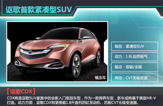 CDX将是讴歌SUV家族中的全新入门级别车型,作为一款跨界车型,新车或将基于美版HR-V打造。动力方面,讴歌CDX有望搭载1.8升直列四缸发动机,匹配CVT无级变速器。在本田HR-V上的这台发动机最大功率103kW,峰值扭矩172Nm,若讴歌CDX同样搭载这台引擎,其将被重新调教。在驱动模式方面,讴歌CDX将保留前驱和AWD全时四驱两种驱动模式。作为本田的高端品牌讴歌从未涉及紧凑SUV领域,此次推出CDX也是顺应潮流,与奔驰等传统竞争对手在产品对位上保持队形。