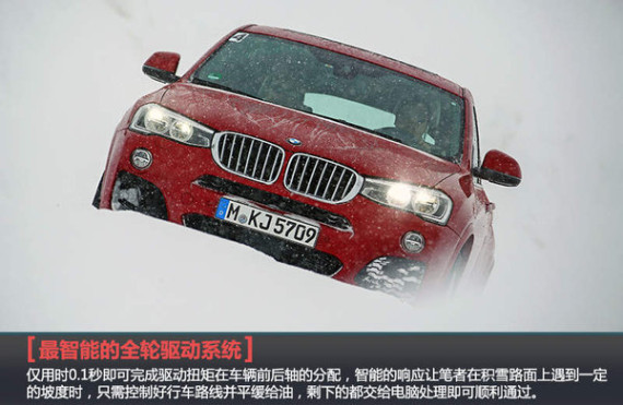 笔者在试驾过程当中充分感受到xDrive全轮驱动系统的智能,该套系统仅用时0.1秒即可完成驱动扭矩在车辆前后轴的分配,系统响应速度非常之快。且动力分配比率十分灵活,通过电控多片式离合器进行控制,可在车辆前后轴之间实现0-100%动力无级分配。实际驾驶当中,在遇到车轮打滑的时候xDrive系统可以主动预判车辆牵引力缺失,并在较早阶段迅速主动完成动力分配。智能的响应让笔者在积雪路面上遇到一定的坡度时,只需控制好行车路线并平缓给油,剩下的都交给电脑处理即可顺利通过。