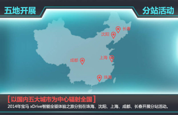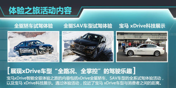 2014宝马xDrive智能全驱体验之旅活动的主要内容包括xDrive全驱轿车、SAV车型的全系试驾体验活动,以及宝马 xDrive科技展示。五次活动共有43家经销店、309家媒体记者以及3000多名消费者参与其中。宝马品牌通过xDrive智能全驱体验之旅,展现了旗下装备xDrive智能全驱技术的车型所带来“全路况、全掌控”的驾驶乐趣,让热爱驾控的人士深度了解和体验到宝马 xDrive智能全轮驱动系统的独特魅力,并拉近了宝马xDrive车型与目标消费人群之间的距离。