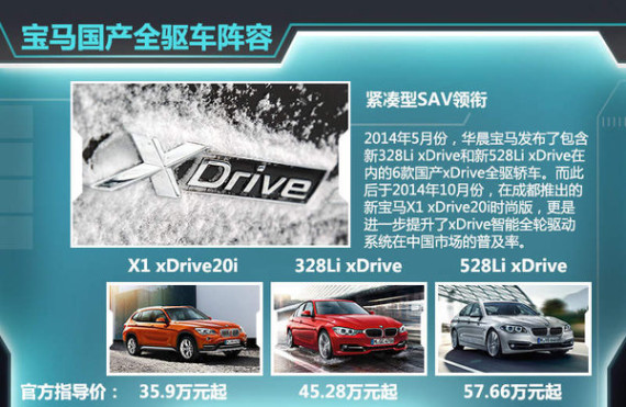 非常值得一提的是,随着国内市场对宝马xDrive车型的需求日益增加,2014年宝马在国内投放了多款配备xDrive技术的国产车型。2014年5月份,华晨宝马发布了包含新328Li xDrive和新528Li xDrive在内的6款国产xDrive全驱轿车。而此后于2014年10月份,在成都推出的新宝马X1 xDrive20i时尚型,更是进一步提升了xDrive智能全轮驱动系统在中国市场的普及率。
