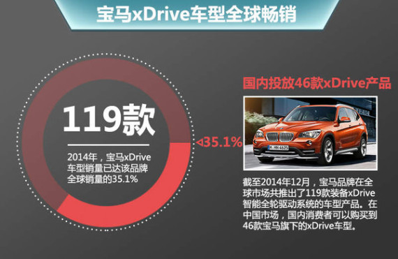 先进的全轮驱动技术,使宝马xDrive车型在全球市场十分畅销。截至2014年12月,宝马品牌在全球市场共推出了119款装备xDrive智能全轮驱动系统的产品,其销量已经达到该品牌全球销量的35.1%。再观国内,宝马品牌在中国市场不断投放xDrive车型,而该车型的市场保有量在不断攀升。与此同时,采用xDrive智能全轮驱动系统的产品线也在持续增加当中。迄今为止,中国消费者可在国内购买到46款配备了xDrive智能全轮驱动系统的宝马车型。
