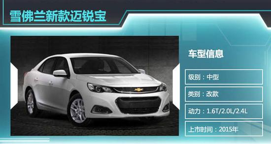 雪佛兰新款迈锐宝有望在2015上海车展正式发布,预计将在年内上市。从网通社获得的工信部申报图来看,新款迈锐宝前脸和车尾部分有所变化,前进气格栅采用了雪佛兰家族的分体式设计,上进气格栅较窄并与前大灯组相连,下进气格栅采用盾形设计,配合保险杠两侧雾灯组设计,使新车看起来非常大气。新车尾灯组造型采用全新设计。此外,新车还配备了三款全新样式的轮圈。新车的长宽高分别为4855/1854/1474mm,轴距2737mm,轴距与目前在售车型相同。动力方面,新款迈锐宝将搭载2.0L、2.4L和1.6T三款发动机,最大功率分别为108kW、134kW和131kW,传动方面,与发动机匹配的或将是6速手自一体变速箱。