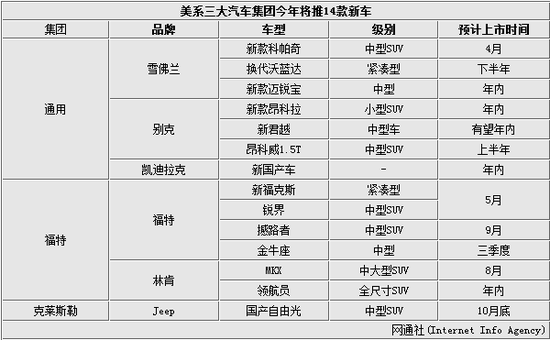 在刚刚过去的2014年,美系三大汽车集团在华销量均取得不同程度的增长。通用在华合资公司上海通用汽车当年全年销量达到176万辆,同比增长11.7%;福特汽车在华乘用车合资企业长安福特2014年批售销量累计达80.16万辆,同比劲增18%;克莱斯勒旗下销售主力品牌——Jeep在中国销售汽车8.8万辆,同比飙升49%,成为Jeep全年涨幅最高的区域。今年三大汽车集团将继续在华发力,推出多款新车型助推销量进一步提升。近日网通社通过整理新车上市新闻获悉,今年美系三大汽车集团将在华推出14款新车,包括改款、换代以及全新车型,其中SUV车型有8款,占到总数的一半以上。