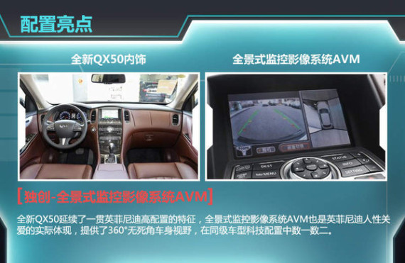 全新QX50延续了一贯英菲尼迪高配置的特征,根据不同车型配有智能巡航系统、盲点警示系统、车道偏离预警系统、胎压监测系统、一键式启动、自动大灯、驾驶员个性记忆系统(包含座椅、方向盘和外后视镜位置记忆)、前排座椅加热、全景影像、Bose音响、导航系统、实时道路交通系统和互动式车载信息系统等丰富配置。其中,全景式监控影像系统AVM也是英菲尼迪人性关爱的实际体现,提供了360°无死角车身视野,在同级车型科技配置中数一数二。