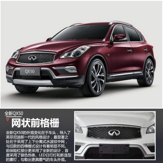 全新QX50的外观变化在于车头,导入了英菲尼迪新一代的风格设计,最显著之处在于采用了上下分离式水波纹中网,与旧款的四横栅式设计有着明显不同。前保险杠部分更采用了全新的设计,首度采用了银色饰条、LED日行灯和新造型的雾灯,勾勒出更具霸气的车头外观。19英寸轮毂、车顶行李架等配置彰显SUV特征。新车的内饰布局与材质选用都与进口车型相当,国产车型的方向盘调整了集成按键、加入了镀铬装饰,中控台还采用了双色调设计,更显精致时尚。另外,新车的车载系统也全部汉化升级,更加方便国内消费群体使用。