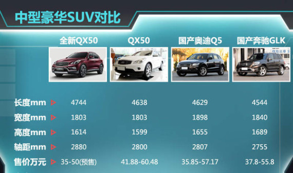 在如今这个SUV叫嚣的时代,汽车厂商不生产一辆“里”“面”合一的中型豪华SUV,真是难以面对国内消费者。继奥迪Q5、宝马X3、奔驰GLK之后,凯迪拉克SRX、沃尔沃XC60等车型也纷纷加入角逐。这些国际性豪华品牌旗下的中型SUV悉数入市后,国内的这一细分市场已沸腾。全新QX50也将成为这一市场的一位强劲对手。从售价来看,全新QX50的入门价相较于进口版车型的41.88万元的便宜了近7万元,而相比奥迪Q5这款性价比较高的车型,全新QX50也有着明显的价格优势。