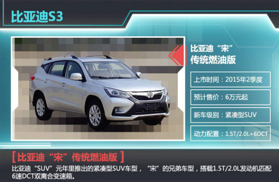 2015年是比亚迪SUV车型集中爆发的一年,被企业称之为“SUV元年”,按照今年比亚迪规划,将面向市场推出多达14款的SUV车型,其中包括多款新能源及传统汽油车型。近日,媒体获悉,比亚迪旗下全新紧凑型SUV S3将于2015年2季度上市,搭载1.5T涡轮增压引擎。值得一提的是, S3正是比亚迪新能源车型“宋”的汽油版车型。