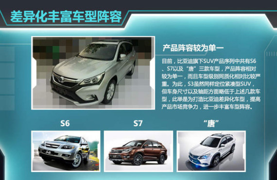 目前,比亚迪旗下SUV产品序列中共有S6、S7以及“唐”三款车型,产品阵容相对较为单一,而且车型级别同质化相对比较严重。为此,S3虽然同样定位紧凑型SUV,但车身尺寸以及轴距方面略低于上述几款车型,此举是为打造比亚迪差异化车型,提高产品市场竞争力,进一步丰富车型阵容。