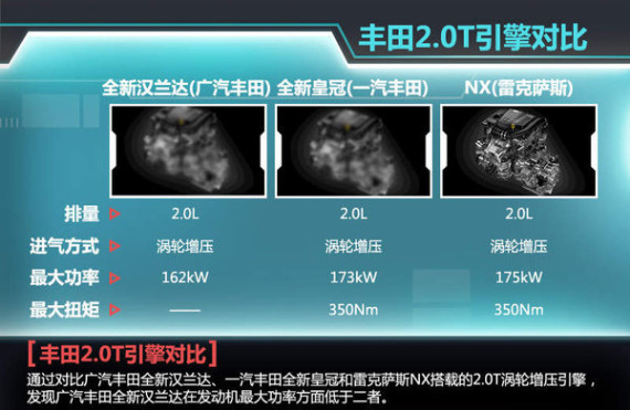 一汽丰田官方此前公布了全新一代皇冠(C级轿车)2.0T车型的相应数据,该车最大输出功率为173kW,最大扭矩为350Nm,与豪华品牌雷克萨斯NX所采用的进口2.0T发动机相比,尽管最大功率值相差仅2kW,但峰值扭矩值保持一致。有一点需要指出的是,全新一代汉兰达动力数值低于这两款车型,最大的因素或是基于车型定位的考虑。
