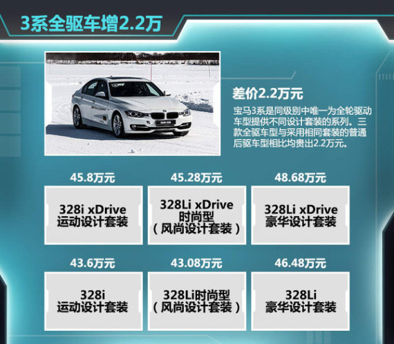 在一开始,我们先来了解一下宝马3系全驱车的售价,这也许是消费者最关心的问题。宝马 3系是同级别中唯一为全轮驱动车型提供不同设计套装的车型。华晨宝马在2014年5月22日正式推出了三款搭载xDrive智能全轮驱动系统的国产宝马3系全驱车,他们分别是售价45.8万元的宝马328i xDrive运动设计套装、售价45.28万元的宝马328Li xDrive时尚型(风尚设计套装)以及售价48.68万元的宝马328Li xDrive豪华设计套装。三款全驱车型与采用相同套装的普通后驱版本相比均贵出2.2万元。