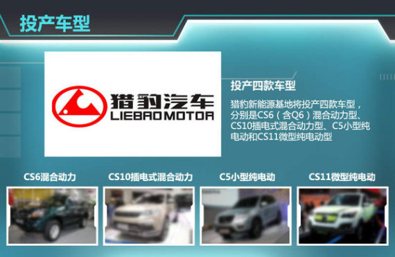 此次猎豹汽车计划建设的新能源基地项目,拟在长沙经开区建设,该项目分为两期建设,将于2015年6月开工。一期工程竣工时间为2016年6月;二期竣工时间为2019年6月。后续该基地将投产四款车型,分别是CS6(含Q6)混合动力SUV、CS10插电式混合动力SUV、C5小型纯电动SUV和CS11微型纯电动SUV,总计年产能达1万辆。