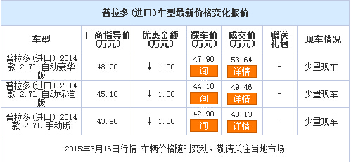 新浪银川汽车讯 近日,编辑从宁夏银川上陵丰田4S店了解到,普拉多 (配置|询价)(进口)现车销售,颜色可选,目前购车部分车型可优惠1.00万元,感兴趣的朋友可以到店咨询或电话垂询。