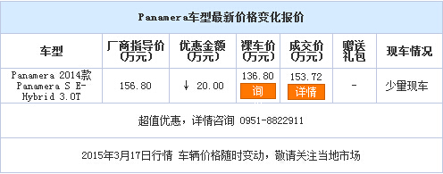 新浪银川汽车讯 近日,编辑从银川保时捷中心了解到,Panamera (配置|询价)现车销售,颜色可选,目前购车部分车型可优惠20.00万元,感兴趣的朋友可以到店咨询或电话垂询。