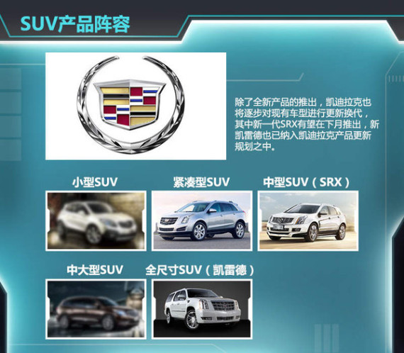 目前凯迪拉克产品阵容中仅有全尺寸SUV凯雷德和中型SUV SRX。根据凯迪拉克新车规划,未来将再推出3款全新SUV产品,其中两款SUV定位低于凯迪拉克SRX,另外一款定位则高于SRX低于凯雷德,为中大型SUV产品。除了全新产品的推出,凯迪拉克也将逐步对现有车型进行更新换代,以适应激烈的市场竞争。其中新一代SRX有望在下月推出,新凯雷德也已纳入凯迪拉克产品更新规划之中。