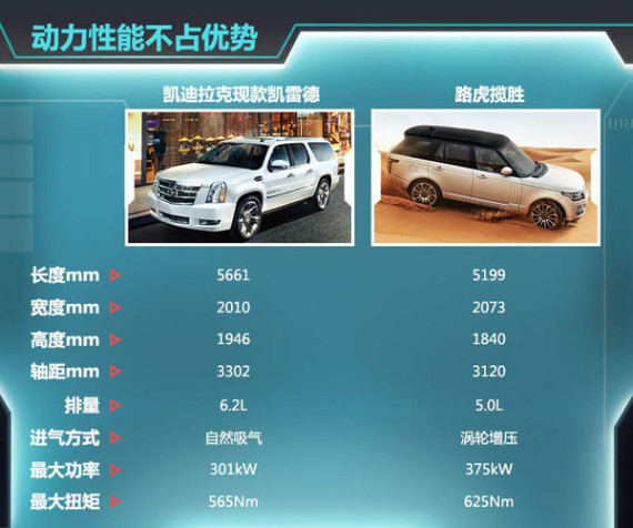 在如今的豪华车领域中,超大型SUV细分市场竞争日趋激烈,凯雷德并不乏竞争对手。目前已上市的路虎揽胜、奔驰GL级、林肯领航员等车型均有不俗实力,此外未来还有奥迪Q9、宝马X7等潜在对手前来挑战。其中路虎揽胜凭借出色的越野性能及豪华车品质,在国内市场拥有叫好又叫座的表现,凯雷德的更新产品未来仍将与其争夺市场份额。仅从目前产品的对比来看,凯雷德在车身尺寸方面占据优势,但在动力则弱于竞争对手。