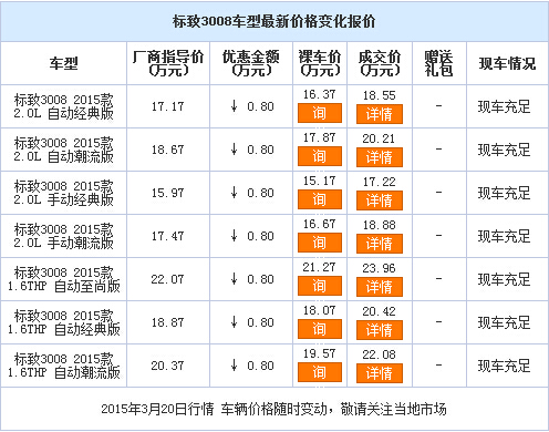 新浪银川汽车讯 近日,编辑从东风标致宁夏标龙4S店了解到,标致3008现车销售,颜色可选,目前购车部分车型可优惠0.80万元,感兴趣的朋友可以到店咨询或电话垂询。