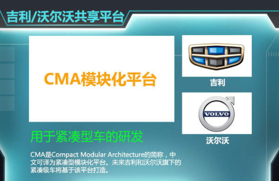 吉利集团在并购沃尔沃汽车后,双方有一个相互理解和融合的过程,出于吉利集团的文化,尤其董事长李书福的开放心态和对沃尔沃的尊重,这一融合格外迅速与顺畅。双方在哥德堡建立了“吉利-沃尔沃联合研发中心”,确认开发全新CMA中级车模块化架构,此前沃尔沃已经单独开发了SPA豪华车平台。第一款CMA平台上开发的吉利中级车将于2016年底在中国上市。