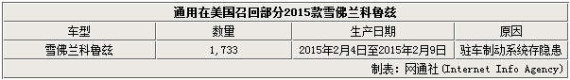 雪佛兰作为美国通用集团旗下汽车品牌之一,自2005年进入中国市场以来,已累计销售超过250万辆汽车。旗下产品覆盖轿车、SUV、MPV和皮卡车等市场,其中轿车序列中的科鲁兹车型可以说在近些年大放异彩,而2015款产品也已于今年与消费者见面。近日,媒体从美国道路国家高速公路安全管理局(NHTSA)获悉,因驻车制动系统存隐患,通用汽车公司正在美国地区对部分2015款科鲁兹实施召回,据统计将有1,733辆车受到影响。