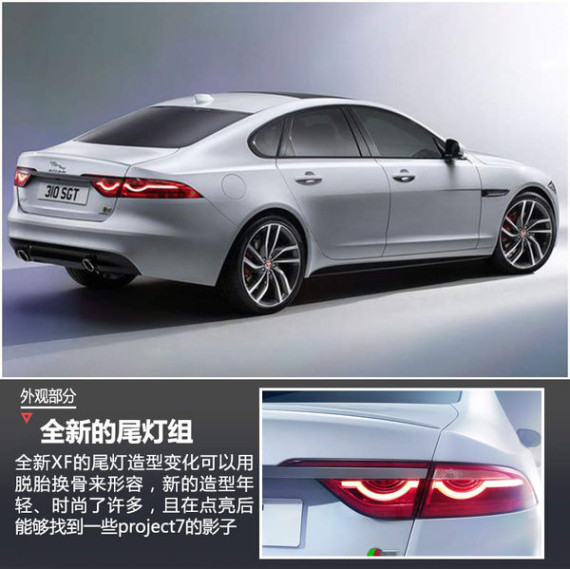 相比于全新XF其它部分轻微的改动,车尾部分则进行了脱胎换骨般的变化,然是依然保持了简洁的设计风格。新车采用了全新设计的尾灯,其造型更年轻、时尚,同时在其点亮后,双下凹型灯组使我们能够发现一些捷豹project7概念车的影子。微微翘起的鸭尾造型尾翼也进一步增添了运动气质。
