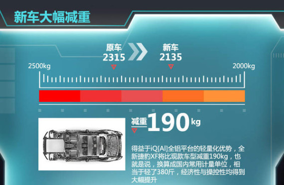捷豹全新一代XF是第二款基于捷豹iQ全铝车身平台打造的车型,其采用的高强度再生铝合金被称为RC5754,这种重量轻、韧性高的材质一般被应用在飞机之上,相比普通钢材,全新铝合金材质可以让捷豹车身比等量钢材坚韧60%。也正因如此捷豹全新一代XF整备质量比现款降低了190kg,也就是380斤,更轻的车身在提升车辆操控性方面贡献巨大。
