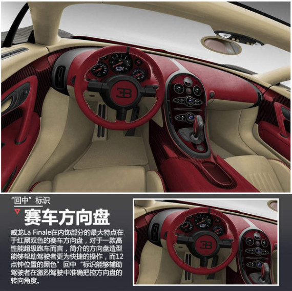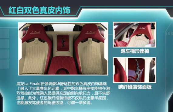 威龙La Finale在强调豪华舒适性的双色真皮内饰基础上融入了大量赛车化元素,其中跑车桶形座椅能够在激烈驾控时为驾乘人员提供充足的侧向承托力,且不失舒适感。此外,红色碳纤维装饰板不仅烘托出豪华氛围,也能激发驾驶者的驾驶欲望,可谓一举多得。