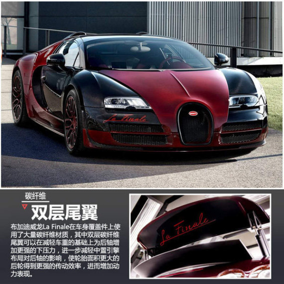 布加迪威龙La Finale在车身覆盖件上使用了大量碳纤维材质,其中双层碳纤维尾翼可以在减轻车重的基础上为后轴增加更强的下压力,进一步减轻中置引擎布局对后轴所造成的惯性影响,使轮胎面积更大的后轮具有更强的传动效率,进而增加动力表现。