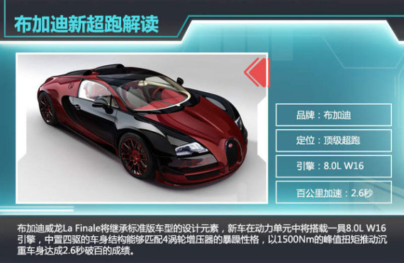 全新威龙La Finale将继承标准版车型的设计元素。新车在动力单元中搭载一具8.0L W16引擎,中置四驱的车身结构能够匹配4涡轮增压器的暴躁性格,以1500Nm的峰值扭矩使沉重车身达成2.6秒破百的成绩,并助力其对抗老对手帕加尼Zonda R。