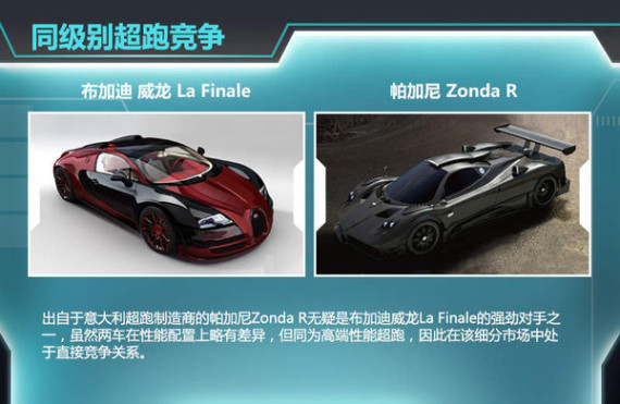 出自于意大利超跑制造商的帕加尼Zonda R无疑是布加迪威龙La Finale的强劲对手之一,虽然两车在性能配置上略有差异,但同属于高端性能超跑行列当中,因此在该细分市场中处于直接竞争关系。