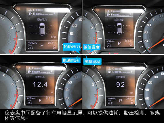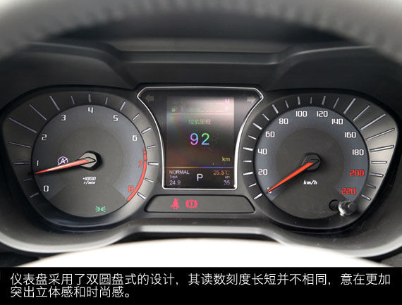 传祺GS4配备了四辐式多功能方向盘,集成了音响控制,蓝牙通讯,行车电脑信息调节,定速巡航系统的控制按键。仪表盘采用了双圆盘式的设计,其读数刻度长短并不相同,意在更加突出立体感。此外,仪表盘中间配备了行车电脑显示屏,可以提供油耗,胎压检测、多媒体等信息。