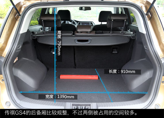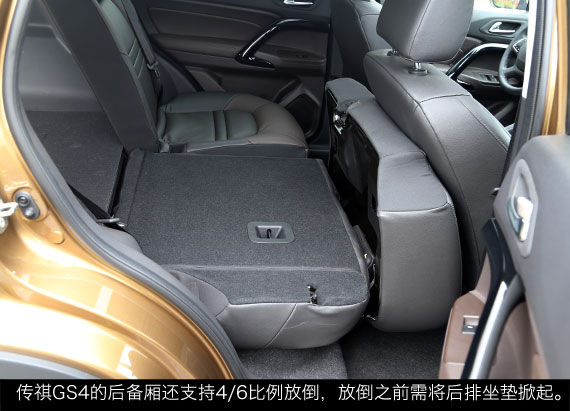 储物空间方面,传祺GS4的表现中规中矩,车内拥有多处放置物品的空间,不过单一的容积也相对较小。而后备厢方面,传祺GS4的后备厢比较规整,不过两侧被占用的空间较多,宽度比较一般。此外,传祺GS4的后备厢还支持4/6比例放倒,放倒之前需要将后排坐垫掀起,这样放倒后后备厢与靠背基本齐平,可以容纳更大的物件。