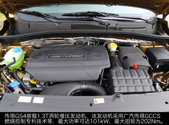 先期上市的传祺GS4搭载1.3T涡轮增压发动机,该发动机采用广汽传祺GCCS燃烧控制专利技术等,最大功率可达101kW,最大扭矩为202Nm。与发动机匹配的是带有运动模式和手动模式的7速双离合变速箱。从账面数据上看,传祺GS4搭载的1.3T涡轮增压发动机与竞争对手相比虽然在排量和输出功率上略有逊色,但是其最大扭矩和油耗与同级别其他车型相比有着比较明显的优势。此外,未来传祺GS4还将推出搭载1.5T涡轮增压发动机的车型,届时传祺GS4在动力方面的竞争力会更强。