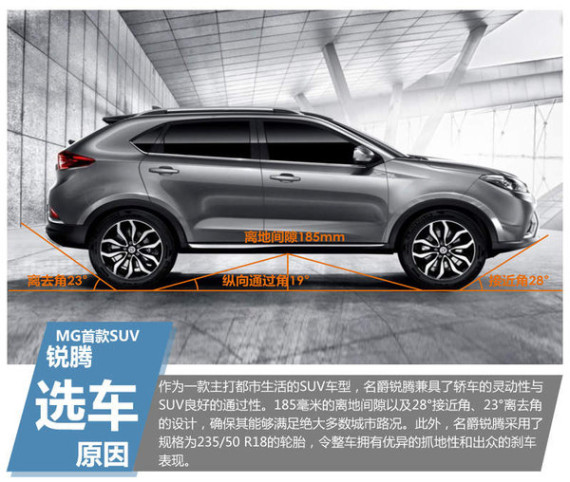 作为一款主打都市生活的SUV车型,名爵锐腾兼具了轿车的灵动性与SUV良好的通过性。185毫米的离地间隙以及28°接近角、23°离去角的设计,确保其能够满足绝大多数城市路况。此外,名爵锐腾采用了规格为235/50 R18的轮胎,令整车拥有优异的抓地性和出众的刹车表现。