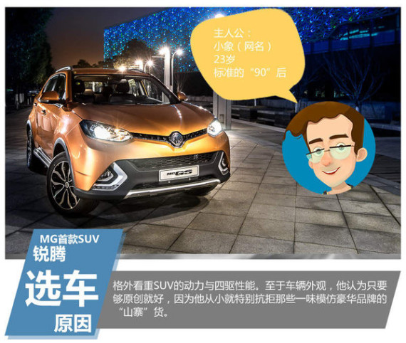 与部分女生走“纯外貌协会”路线不同,小象更多时候是个现实主义者,所以对具体的车型参数基本都了如指掌。当我们有意考他有关名爵锐腾的信息时,小象竟然不假思索地说出了各项尺寸。由此来看,他私下里就对MG首款SUV关注甚多。
