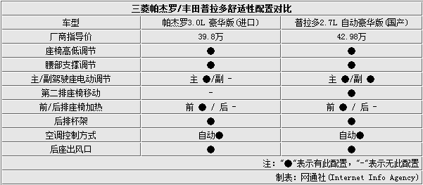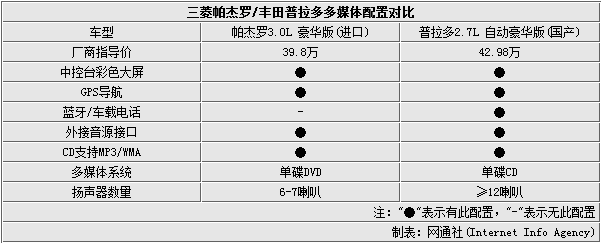 此外,三菱帕杰罗3.0L 豪华版与普拉多2.7L 自动豪华版在多媒体以及舒适性配置上也有一定区别,但不如前几项明显,后者比前者多出蓝牙/车载电话、副驾驶座电动调节、第二排座椅移动等。