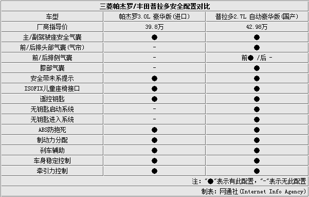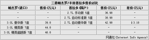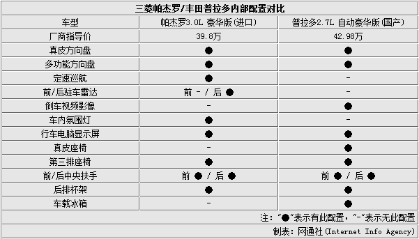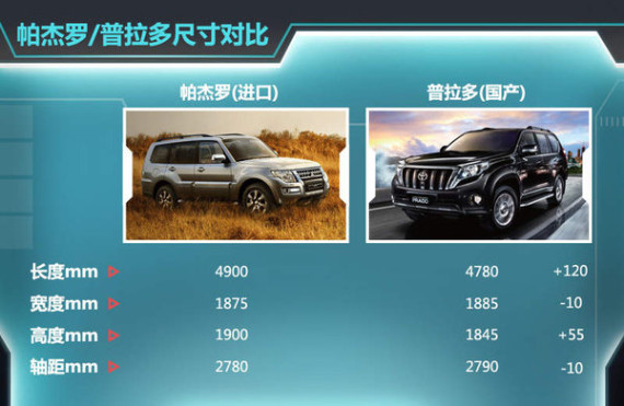 丰田国产普拉多 (配置|询价)2.7L车型日前已正式上市,该车下探至36.98万元的起售价格,相对于原来进口车型有一定吸引力,作为普拉多“老对手”的三菱帕杰罗目前则采用的是进口形式,全系标配7座并且提供差速器锁止功能。一款国产车型,一款进口车型,看起来两款车型各有特点,但到底哪款性价比更高成为许多消费者关注的焦点,接下来网通社针对两款车型价格相差3.18万元的7座入门版本进行了对比,通过实际数据来解答这一问题。