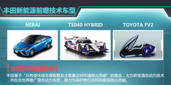 虽然在混合动力领域获得了成功,但是丰田并没有停滞不前,混合动力车型的研发仍在继续,其新能源前瞻技术车型世界首款量产燃料电池车“MIRAI”,油电混合双擎动力赛车“TS040 HYBRID”,以及能够实现人车相互沟通的概念车“TOYOTA FV2”即为代表。相信经过丰田的不断努力,日益严重的环保问题可以得到有效缓解。