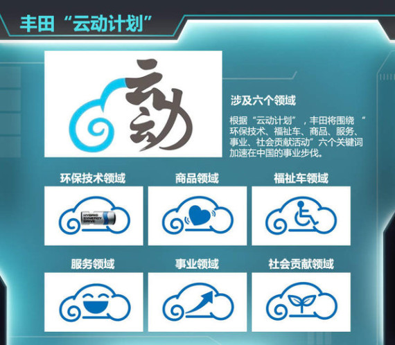 2012年3月1日,丰田(中国)在北京举行丰田中国“云动计划”启动仪式,根据这一计划,丰田将围绕 “环保技术、福祉车、商品、服务、事业、社会贡献活动”六个关键词加速在中国的事业步伐。其中“环保技术”是重中之重,丰田将从“节油”和“摆脱石油”两个角度,推行“节能的传统汽车和新能源汽车”并驾齐驱的战略,以满足中国消费者以及中国社会日益增长的节能减排、低碳环保需求。